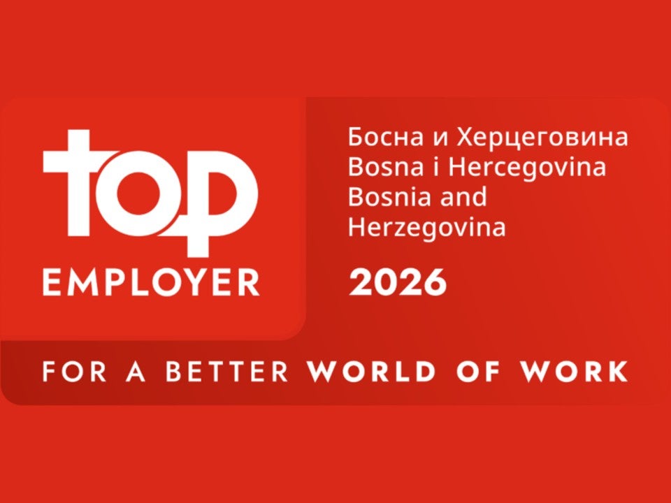 Kao organizacija koja njeguje moderne HR prakse i visoke standarde zaposleničkog iskustva, ponosni smo nosilac Top Employer sertifikata za Bosnu i Hercegovinu zajedno sa NLB Banka a.d. Sarajevo – međunarodnog priznanja koje dobijaju kompanije sa izvanrednim uslovima rada, snažnom kulturom ljudi i strateškim pristupom razvoju talenata.