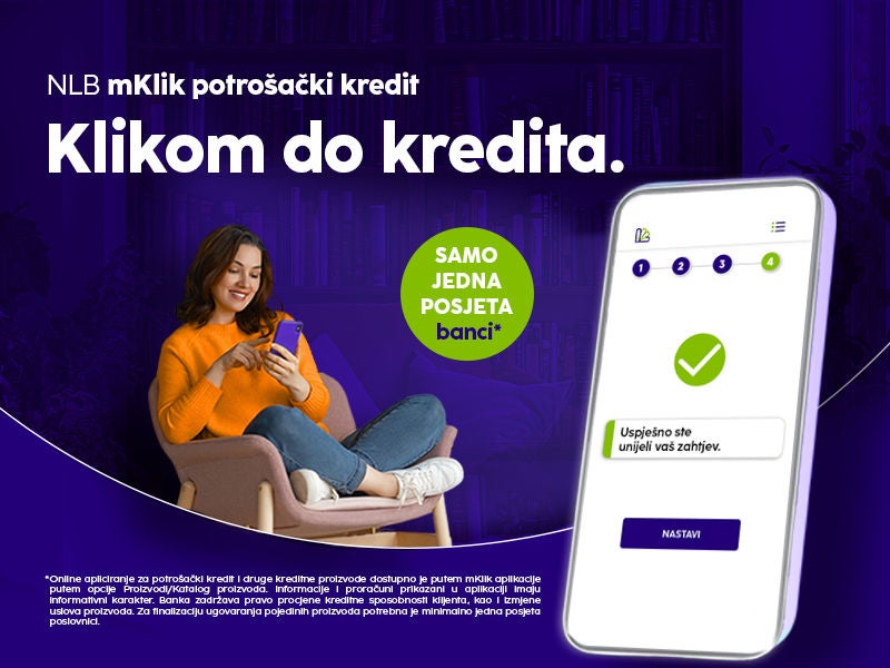 NLB mKlik aplikacija je dostupna korisnicima na Android, iOS i Huawei uređajima, a omogućava jednostavnu prijavu, pregled računa i kartica, plaćanje mjesečnih obaveza, podešavanje sigurnosnih postavki prema individualnim potrebama, P2P slanja novca, kao i mnoge druge napredne funkcionalnosti, među kojima je sada i apliciranje za potrošački kredit.